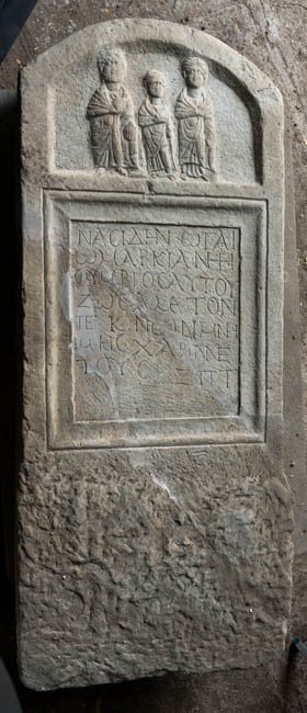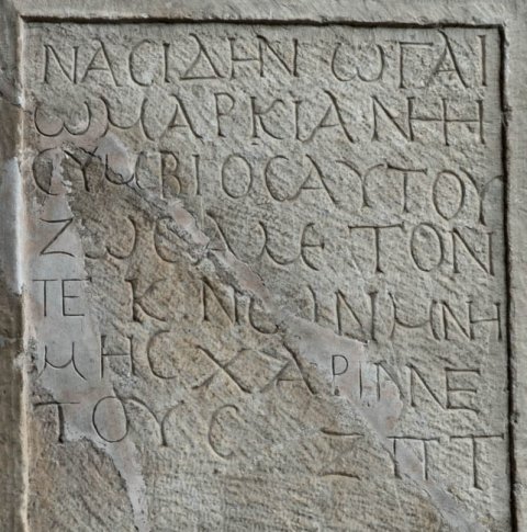 - griechisch: Νασιδηνῷ Γαΐ/ῳ Μαρκιανὴ ἡ / σύμβιος αὐτοῦ / ζῶσα με(τὰ) το͂ν / τέκνων μνή/μης χάριν, ἔ/τους ζπτʹ