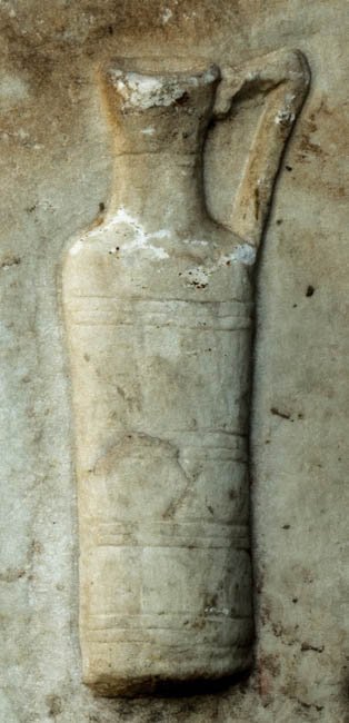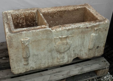 - Kastenförmiges Becken mit Ausflusslöchern im Boden, auf der linken Seite unten und am oberen Rand, Bleirohr im Boden. Kleineres Innenbecken. Auf der Vorderseite drei Gefäße (hoher Becher, Krater, beide mit Reliefdekor, und Henkelkanne.