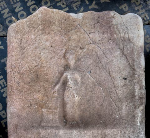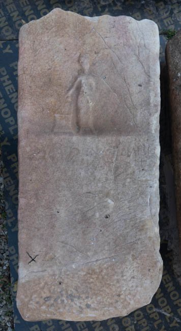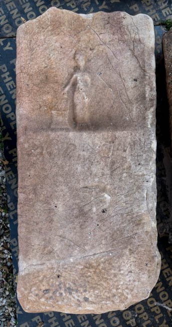 - Bildfeld mit an einem Altar opfernder Figur im langen Gewand. Unterhalb unkenntliche Inschriftreste.