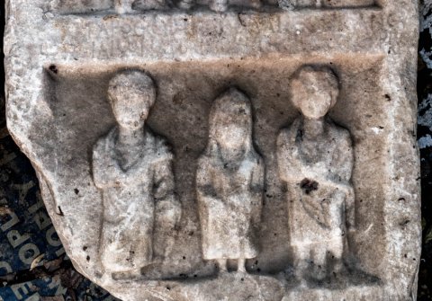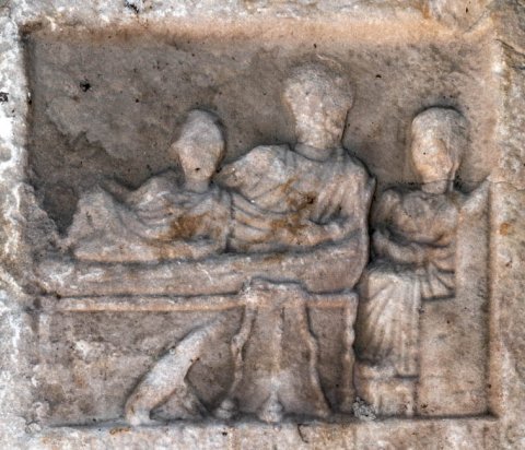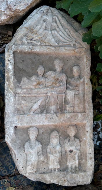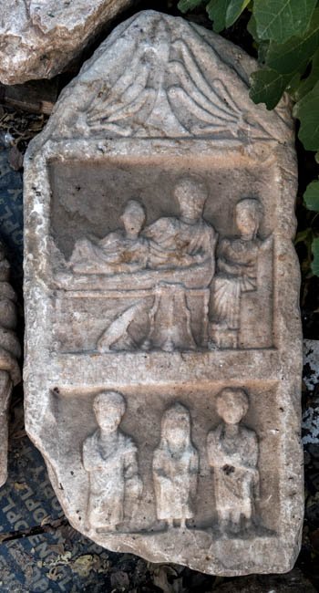 - Giebel mit Pinienzapfen zwischen Palmetten. Zwei Bildfelder übereinander. Oben Totenmahl: zwei Personen (Mann und Knabe ?) auf Kline, rechts sitzende Frau, unter der Kline Hund, vorn Tischchen. Unten drei stehende Personen einer Familie (Mann, Knabe im Kapuzenmantel, Frau). Zwischen den Bildfeldern zweizeilige Inschrift.