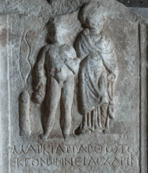 - Gerahmtes Feld, darin über der Inschrift zwei stehende Personen. Links nackter Kanbe als Eros, in der rechten Hand Traube, in der linken Vogel (?), neben der rechten Schulter Bogen, darunter Köcher. neben ihm Frau in Chiton und Mantel.