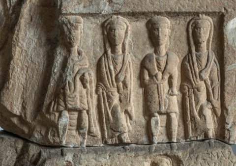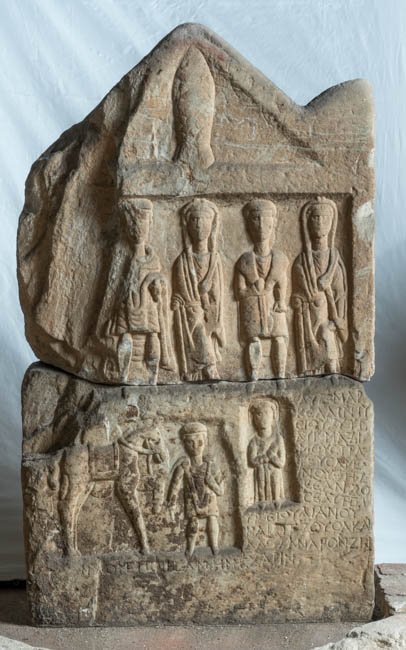 - Giebel mit Seitenakroteren, im Giebelfeld Pinienzapfen. Im oberen Bildfeld vier stehende Personen, links ist eine fünfte anzunehmen. Mann (Soldat) in kurzer Tunica und Mantel, Frau mit über den Kopf gezogenem Mantel und Scheitelschmuck (?). Mann in kurzer Tunica und Mantel (Paenula ?), Frau mit über den Kopf gezogem Mantel und Scheitelschmuck (?). Darunter zwei unregelmäig eingetiefte Bildfelder, rechts mit stehender Frau mit Schleier, links mit Calo, in der Linken Werkzeug (Beil ? Hammer ?), und gesatteltem Pferd.