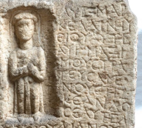 - griechisch: Αὐρ(ηλία) ∙ Μαρ/κελλίνη υ/εἱοῦ αὑτῆς / Αὐρ(ηλίου) ∙ Μαξί/μου στρα/τευσαμέ/νου ἔτη ∙ ζʹ / κὲ ἀνδρὸ/ς ἑαυτῆς Α/ὐρ(ηλίου) ∙ Εἰουλιανοῦ / καὶ ἁτῆς ζοῦσα, καὶ / Ἀλέξανδρον ζῶ/ν υἱὸν ἐποίησα μνήμης χάριν