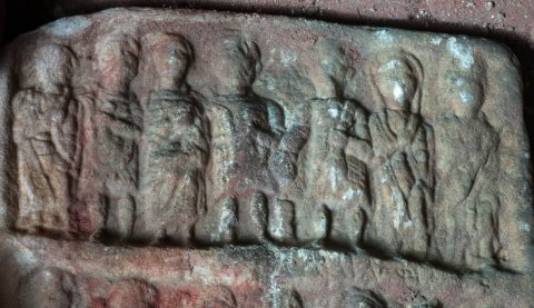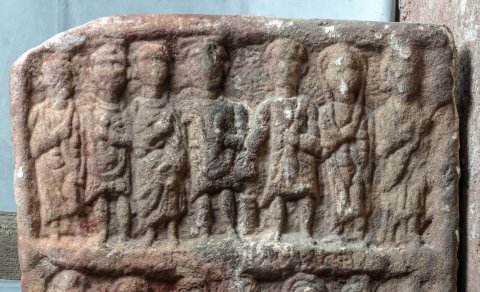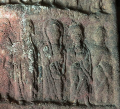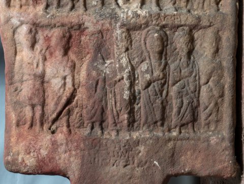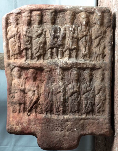 - Zwei Bildfelder übereinander mit jeweils sieben stehenden Personen. Oben in der Mitte Altar, an dem die dritte Person von rechts (Mann in kurzer Tunica , in der Linken mappa) aus einer Schale opfert. Rechts von ihm zwei Frauen, links Soldat, Mann, Soldat, Frau. Unten von links nach rechts Mann in kurzer Tunica, der etwas schultert (Soldat ?), zwei Männer im Mantel, zwei Frauen mit Schleier, Mann im Mantel, Frau. Inschriftreste auf dem mittleren und unteren Rahmen.