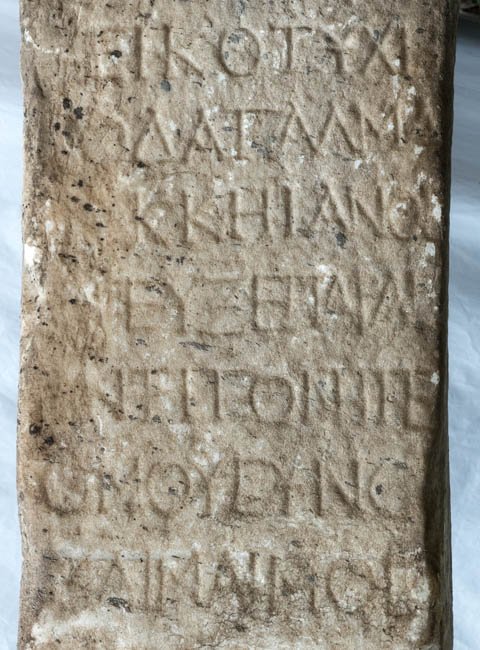 - griechisch: Νεικοτύχῃ / τόδ’ ἄγαλμα / Κοκκηιανὸς / [ἔ]τευξ’ ἐπάρας / Ἀντιγόνη τε / ὁμοῦ συνό/μαι{μαι}μος / [------]