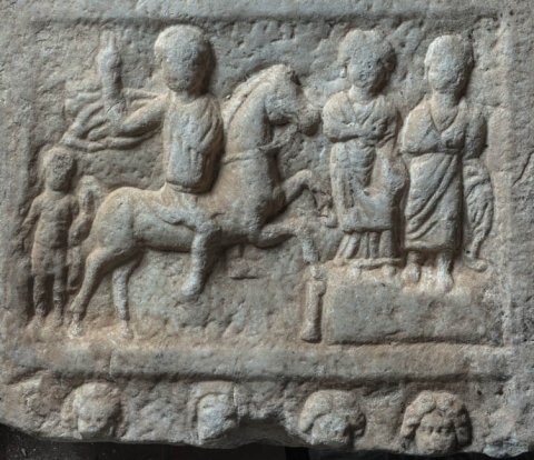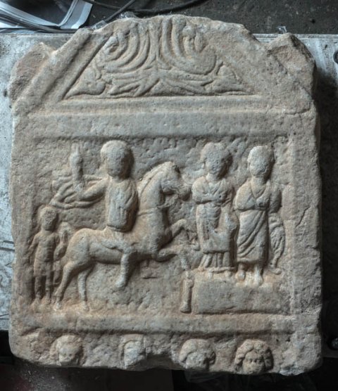 - Giebel mit Blattdekor und Seitenakroteren. Zwei Eildfelder übereinander. Oben Reiter mit Calo, vor ihm Podest mit zwei stehenden Personen (Frau, Mann). Unten nur Teile der Köpfe von vier Personen (Familie) erhalten (rechts zwei Frauen).