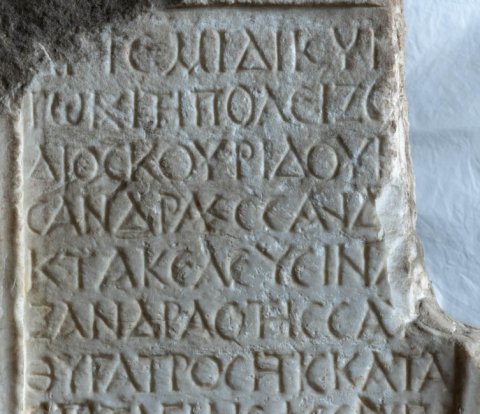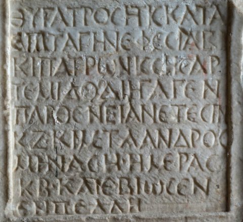 griechisch: Ἀ̣ρ̣τέμιδι Κυν[α]/γῷ καὶ τῇ πόλει Ζω[ΐλος] / Διοσκουρίδου κ[αὶ Κασ]/σάνδρα Κασσάνδ[ρου] / κατὰ κέλευσιν Ἀ[λε]/ξάνδρας τῆς ἑαυ[τῶν] / θυγατρός, ἥτις κατὰ / ἐπιταγὴν Ἐφεσίας / καὶ πατρωνίσσης Ἀρ/τέμιδος διήγαγεν