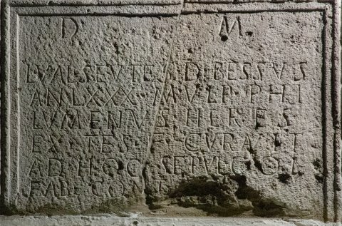 - D(is) M(anibus) / L(ucius) Val(erius) Seutes d(omo) Bessus / an(norum) LXXX M(arcus) Ulpius Phi/lumenus heres / ex tes(tamento) f(aciendum) curavit / ad hoc sepul(crum) col(legium) fab(rum) con(tulit) [(denarios) ---]