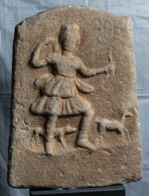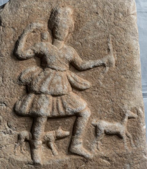 - Mythische Figur: Diana auf der Jagd, mit Bogen und Köcher, hinter ihren Beinen Hund, vor ihr Hirschkuh.