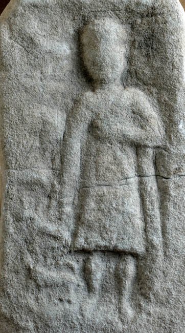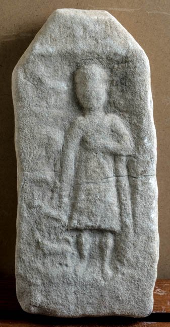 - Mythische Figur: frontel stehende Diana (?) im kurzen Geand und Mantel, neben ihrere rechten Seite übereinander gestaffelte Tiere.