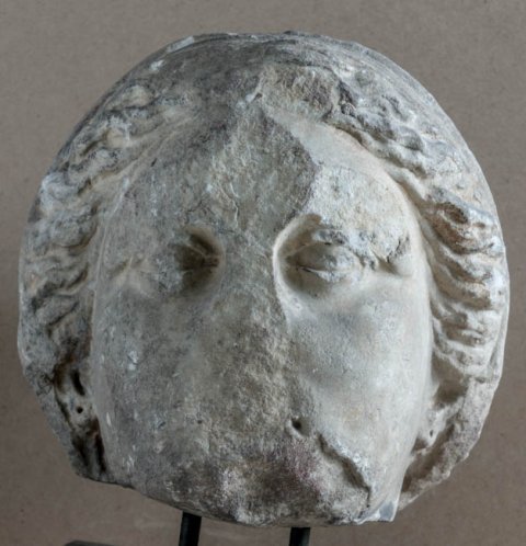- Idealtypischer Frauenkopf mit eng um den Kopf gelegtem Schleier, Bohrung in den Ohrläppchen.
