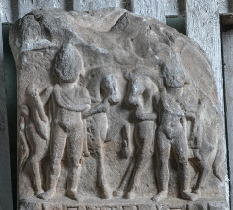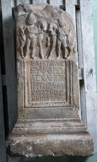 - Mythische Figuren: über dem Schriftfeld rahmenloses Bildfeld mit Dioskuren, vor ihren Pferden stehend.