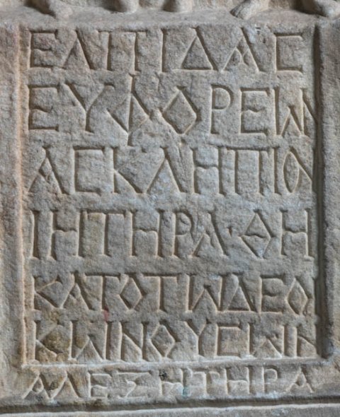 - griechisch: ἐλπίδας / εὖ φορέων / Ἀσκληπιὸν / ἰητῆρα θή/κατο τῷδε οἴ/κῳ νούσων / ἀλεξητῆρα