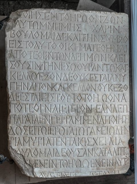 - griechisch: [---]ς Λύκιος / [ἐπ]οίησεν τὸ ἡρῷον ζῶν / [ἑ]αυτῷ μνήμης ∙ χάριν / βούλομαι δὲ καὶ τὴν σύμβιον / εἰς τὸ αὐτὸ οἴκημα τεθῆναι / ἀποτεθέντων δὲ ἡμῶν κλεί/σουσιν τὴν ἔσω θύραν τῷ καγ/κέλλῳ, ἐξὸν δὲ οὐκ ἔσται ἀνυ/γῆναι τὸν κάγκελλον, οὐκ ἐξὸν / δὲ ἔσται εἰς τοῦτο τὸ ἡρῷον ἀ/ποτεθῆναι ἕτερον. ἐὰν δέ τις / παρὰ τὰ ἐνγεγραμ[μέν]α ποιήσῃ / δώσει τῷ ἱερωτάτῳ ταμείῳ δηνά/ρια μύρια πεντάκις χείλια / [β]ούλομαι δὲ οὓς ἂν καταλίπω / [παρα]μένειν τῷ ἡρῴῳ ἔχειν αὐτοῦ / [---]ους τὰς ἐγγὺς τοῦ ἡρ[ῴου] / [---