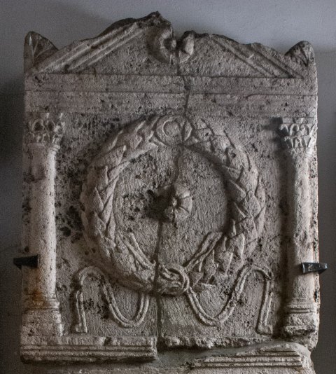 Im Hauptbild zwischen Säulen Kranz mit Tänien und Clipeus, innen Rosette. Schriftfeld zwischen Pilastern. - Inschrift