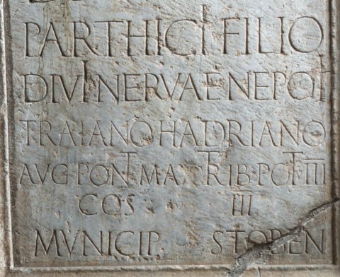 - Imp(eratori) Caes(ari) / divi Traiani / Parthici filio / divi Nervae nepoti / Traiano Hadriano / Aug(usto) pont(ifici) max(imo) trib(unicia) pot(estate) III / co(n)s(uli) III / municip(ium) Stoben(sium)