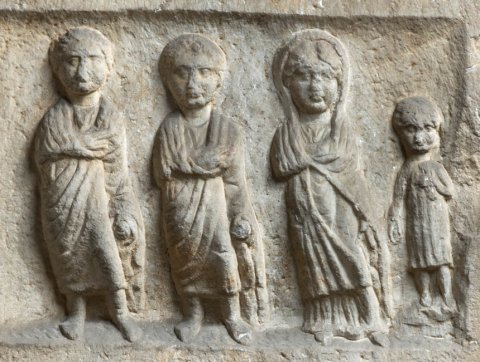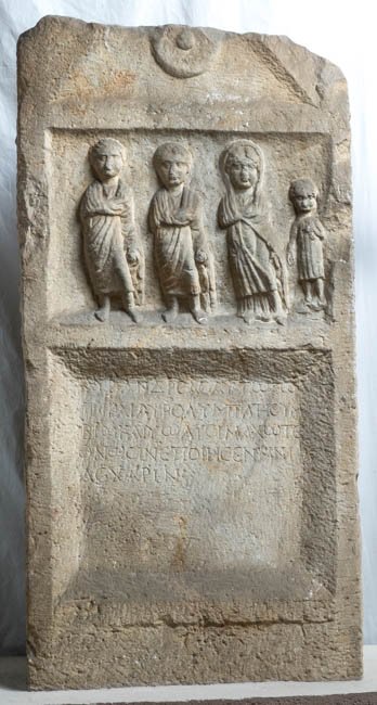 - Im Giebel Schale. Bildfeld mit vier sthenden Personen einer Familie: zwei Männern im Mantel (Toga ?), Frau mit über den Kopf gezogenen Mantel, Kind (Knabe) auf Podest.