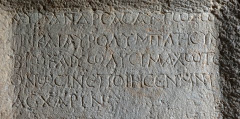 - griechisch: Αὐρ(ήλιος) Ἀνδρέας αὑτῷ ζῶ/τι καὶ Αὐρ(ηλίᾳ) Ὀλυμπίᾳ τῇ συμ/βίῳ καὶ ὑῷ Λυσιμάχῳ τε/θνῶσιν ἐποίησεν μνί/ας χάριν