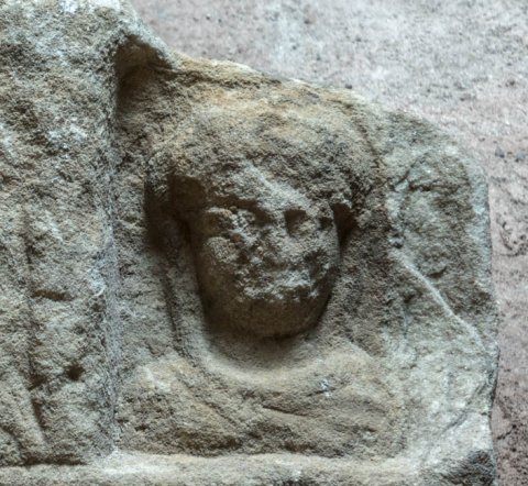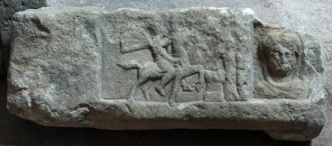 - Zwei Relieffelder nebeneinander. Links Thrakischer Reiter, vor ihm Altar und Baum mit Schlange. Rechts Büste einer Frau mit Schleier.