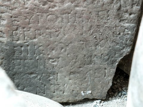 - unten abgebr., Inschrift stark verrieben, übrige Flächen abgearbeitet