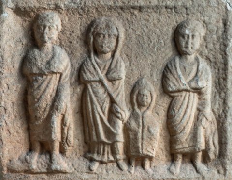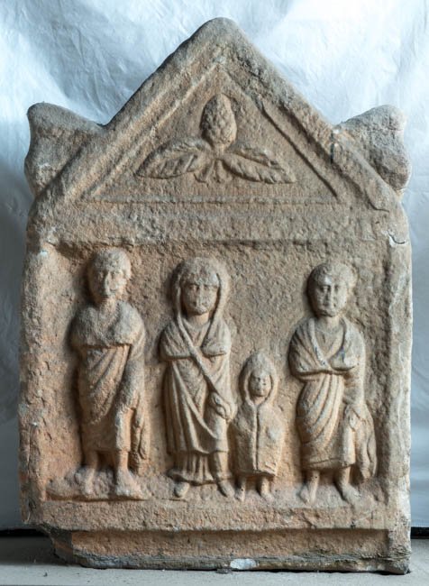 - Giebel mit Blattdekor, Seitenakrotere. Im Bildfeld vier stehende Personen einer Familie: Mann Jüngling), Frau mit über den Kopf gezogendem Mantel, Kind (Knabe) in Kapuzenmantel (cuculla), baertiger Mann.