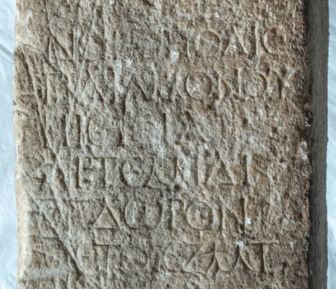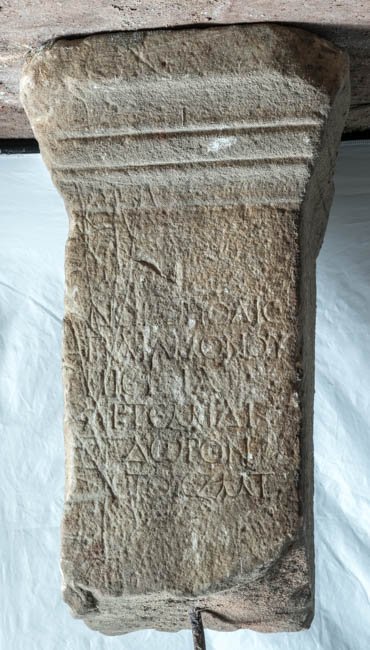 - griechisch: Νεικ̣όπολις / Παραμόνου / ἡ ἱέρεια / Ἀρτέμιδι / δῶρον / ἔτου̣ς ζμτʹ
