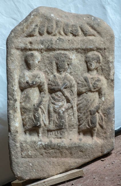 - Giebel mit Blattdekor. Im Bildfeld drei stehende Personen (Familie): Frau mit über den Kopf gezogenem Mantel zwischen zwei Männern.