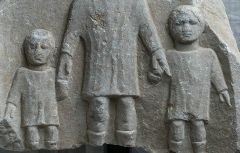 - Familie: stehender bärtiger Mann, an jeder Hand einen Knaben. Alle drei tragen eine kurze Ärmeltunica und Stiefel.