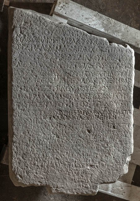 - 5 Zeilen, davon die ersten 4 rechts abgebr. / ἔτους ἑνὸς διακοσιοστοῦ / ἀλειφούσης τῆς πόλεως, ἐγλαβόν/τος Εὐβουλίδου τοῦ Ζωΐλου ἀλε̣/ῖψαι κυάθῳ, ἤλιψεν δρακτῷ ἐφηβαρχ/οῦντος Ζωΐλου τοῦ Εὐβουλίδου / ἀναγραφὴ τῶν ἐφηβευσάντων / πρωτοστατοῦντος Ζωΐλου τοῦ / Νικοστ[[ράτου ---]] ?/νίου Πο[[σ̣ε̣[ιδ---]] ? / Reste von 10 ? weiteren Zeilen