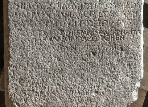 - griechisch: ἔτους ἑνὸς διακοσιοστοῦ / ἀλειφούσης τῆς πόλεως, ἐγλαβόν/τος Εὐβουλίδου τοῦ Ζωΐλου ἀλε̣/ῖψαι κυάθῳ, ἤλιψεν δρακτῷ ἐφηβαρχ/οῦντος Ζωΐλου τοῦ Εὐβουλίδου / ἀναγραφὴ τῶν ἐφηβευσάντων / πρωτοστατοῦντος Ζωΐλου τοῦ / Νικοστ[[ράτου ---]]/νίου Πο[[σ̣ε̣[ιδ---]]