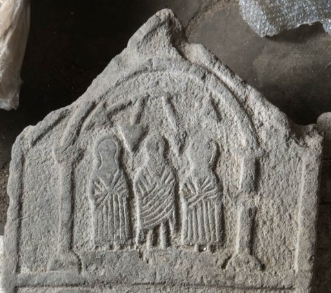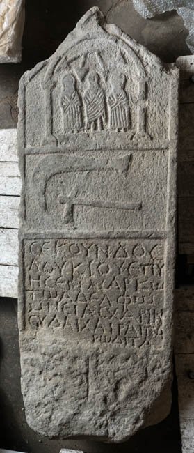 - Stele mit Giebel, darin Bogen auf Säulen, dazwischen unter Blattranke stehende Personen (Familie: Frau, Mann, Frau). Zwischenbild mit Werkzeugen (Hacke, Winzermesser).