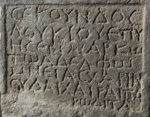 - griechisch: Σεκοῦνδος / Λουκίου ἐπύ/ησεν Μάρκῳ /τῷ ἀδελφῷ / μνείας χάριν / σὺ δαὶ χαῖραι πα/ρωδῖτα