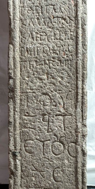 σὺν τέκνοις / ἴδιος νόμου / κα<ὶ> συμβίου ἐ/μνήσθη κάτο / καὶ ἐτίμησε / Λούκιος υἱὸς / ἐμὸς μνη/σθείς μου / καμάτων / καὶ εὐηρε/σίης(?) μετὰ / τέκνων / τοῦ / ζϙτʹ / ἔτους / 𐆖 σʹ