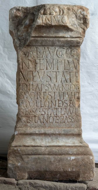 - [Deo] Inv(i)c[to pro] // sal(ute) Aug[[g(ustorum)]] / n[[n(ostrorum)]] templum / vetustate / dilapsum i<m=N>pendio suo restituit / Apollonides eor(undem) / ser(vus) sc(rutator) stat(ionis) Lamud() / Gentiano et Bass(o) co(n)s(ulibus)