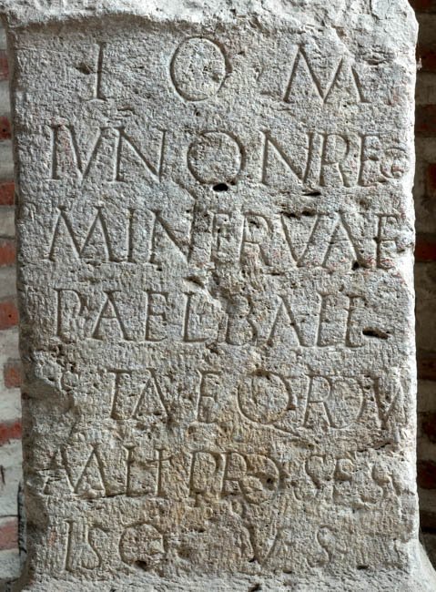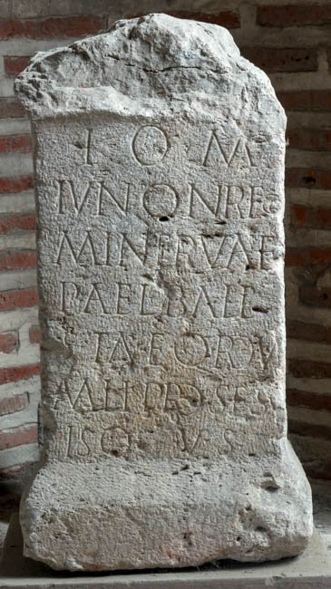 - I(ovi) O(ptimo) M(aximo) / Iunoni Reg(inae) / Minervae / P(ublius) Ael(ius) Balli/sta eque(s) Rom(anus) / a milit(iis) pro se su/isque v(otum) s(olvit)