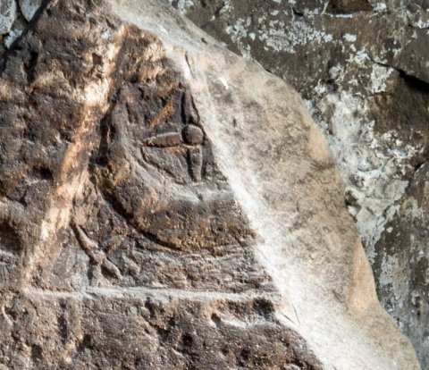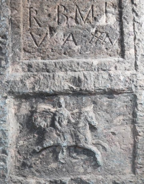 - Giebel mit Mondsichel und Stern. Sockelbild mit Reiter (Soldat).