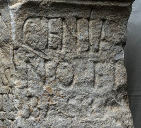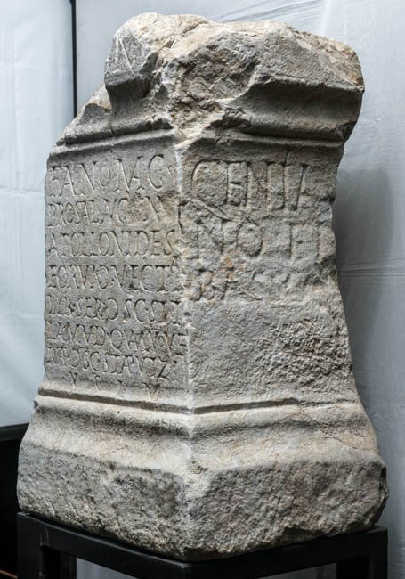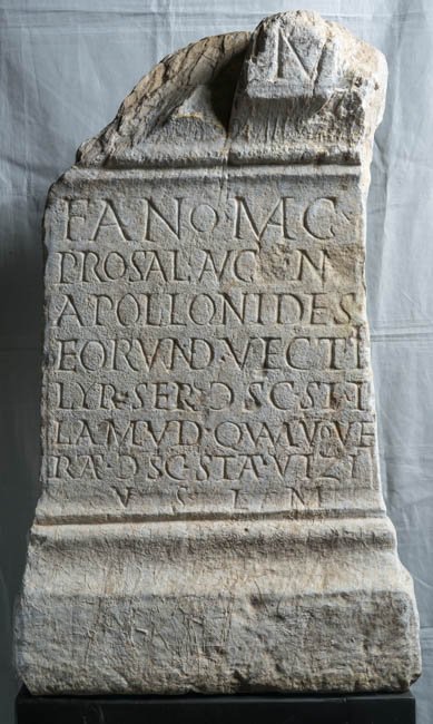 - [D(eo) i(nvicto)] M(ithrae) / fano mag(no) / pro sal(ute) Aug[[g(ustorum)]] n[[n]](ostrorum) / Apollonides / eorund(em) vect(igalis) Il/lyr(ici) ser(vus) |(contra)sc(riptor) st(ationis) / Lamud(---) quam vove/rat |(contra)sc(riptor) sta(tionis) Vizi(ani) // A(pollo)n(ides)s Viz(iani) // Gentia/no et / Basso [co(n)s(ulibus)]
