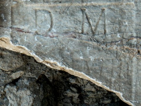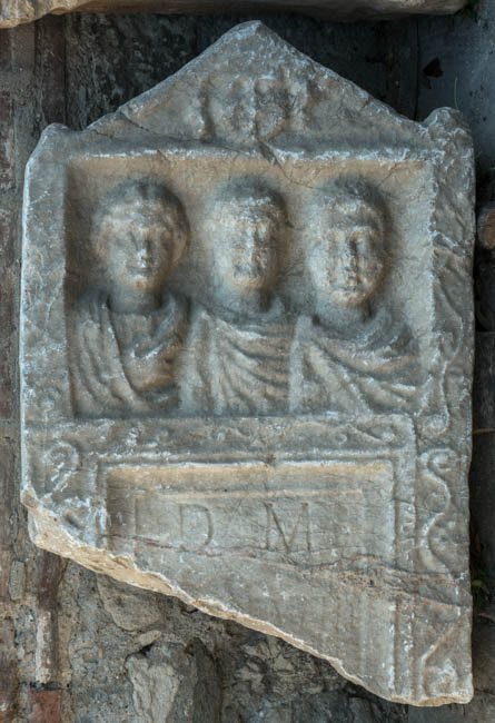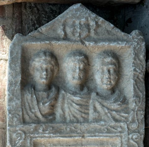 - Giebel mit Gorgoneion und Seitenakroteren. Im Bildfeld drei Büsten (Familie): Frau im Mantel, zwei Männer im Sagum. Auf den Rahmenleisten Ranken.