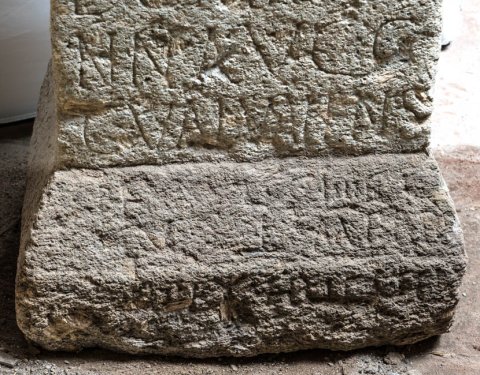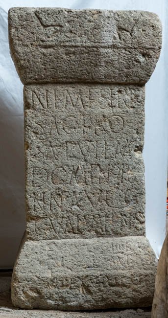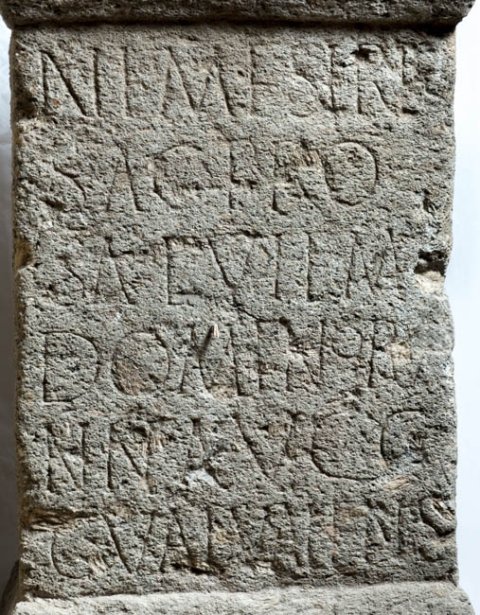 - Nemesi reg(inae) / sac(rum) pro / salutem(!) / dominor(um) / nn(ostrorum) Augg(ustorum) / C(aius) Val(erius) Valens // b(ene)f(iciarius) co(n)s(ularis) leg(ionis) IIII Fl(aviae) / v(otum) l(ibens) l(aetus) me(rito) po[s(uit)]
