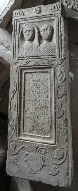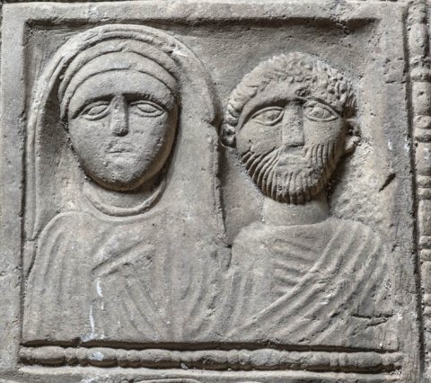 - Horizontaler Abschluss mit Palmettenakroteren und Pinienzapfen in der Mitte. Im Bildfeld zwei Brustbilder (Ehepaar), links Frau mit Haube und Schleier, rechts baertiger Mann. Bildfeld oben mit tordiertem Stab, seitlich und unten mit Atstragalstab gerahmt. Auf den Rahmenleisten um das Schriftfeld Ranken mit Efeublättern und Weintrauben, die aus einem Krater wachsen.