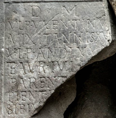 - heutiger Zustand: D(is) M(anibus) / Ulp(ius) Valentinu[s] / vixit annis XV / Ulp(ius) Andinus / et Aur(elia) Iuli[a] / parent[es filio] / pienti[ssimo et] / sibi v[ivis m(erentibus) p(osuerunt)]