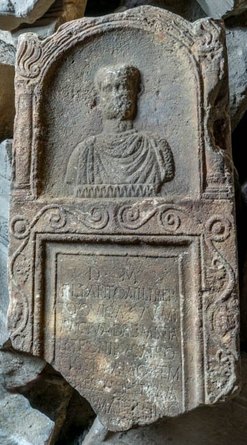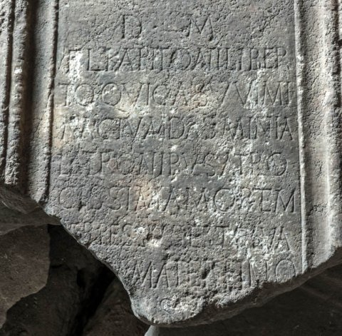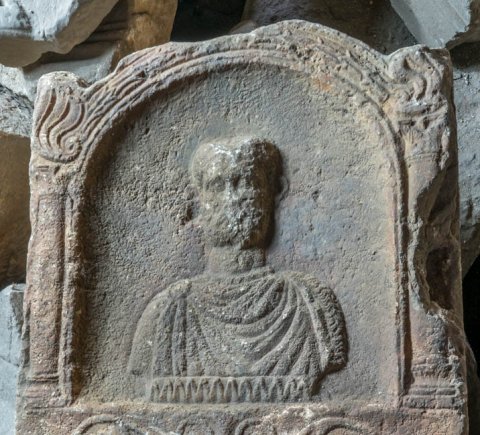 - Bildfeld mit Bogen auf Säulen, darüber Palmettenakrotere. Bogenrahmen mit Blattgirlande. Büste eines bärtigen Mann im Sagum mit Scheibenfibel und Fransensaum. Unter der Büste Blattreihe. Auf den Rahmenleisten des Schriftfeldes Weinranken.