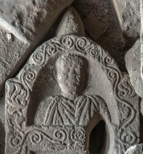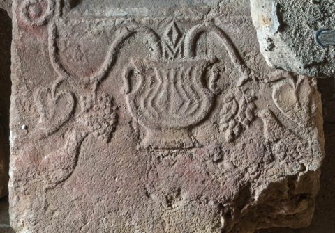 - Bogennische mit Brustbild eines baertigen Mannes, auf der rechten Schulter Scheibenfibel. Seitlich Palmettenakrotere, auf der Rahmenleiste Spiralranken. Unter dem Schriftfeld Krater, flankiert von Vögeln, aus dem Weinranken wachsen.