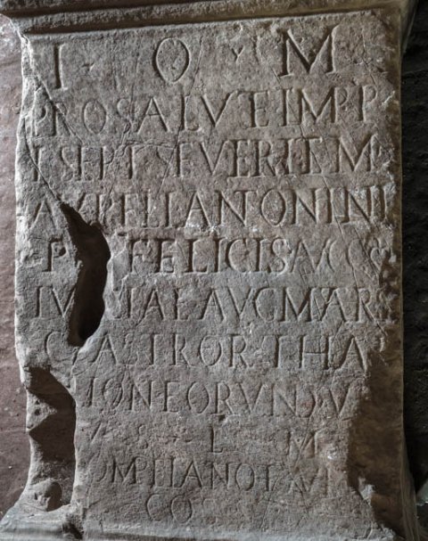 - I(ovi) O(ptimo) M(aximo) / pro salute Impp(eratorum) / L(uci) Sept(imi) Severi et M(arci) / Aureli Antonini / P[ii] Felicis Augg(ustorum) / Iu[l]iae Aug(ustae) matr(is) / castror(um) Tha/[l]lion eorund(em) v[il(icus)] / v(otum) s(olvit) l(ibens) m(erito) / Pompeiano et Avi[to] / co(n)s(ulibus)