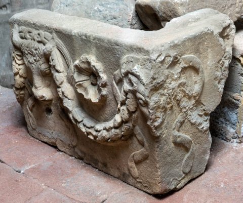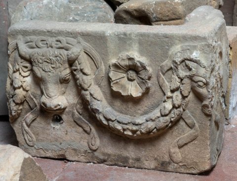 - Girlanden mit Taenien an Stier- und Widderköpfen, in den Girlandenbögen Rosetten.