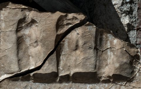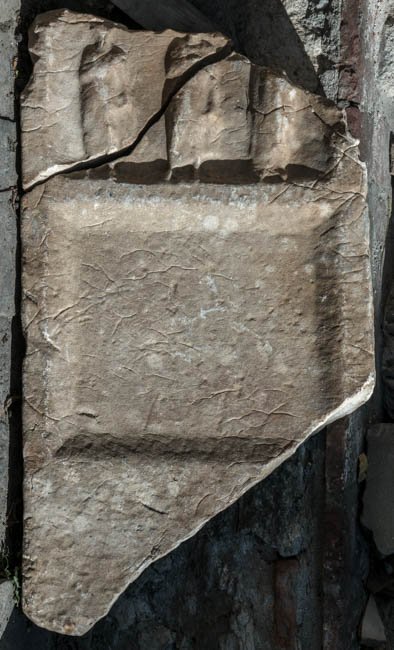 - oben u. unten abgebr., in 2 Teile zerbrochen, stark verrieben