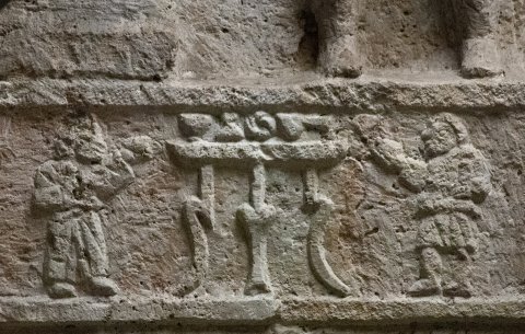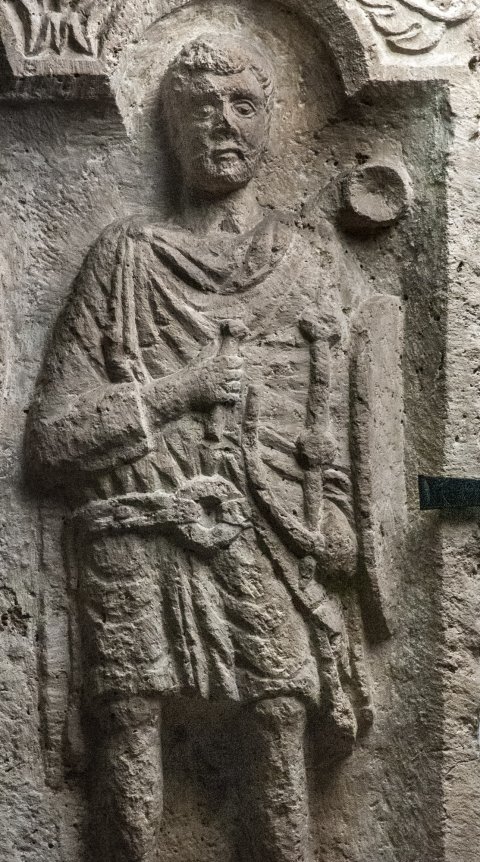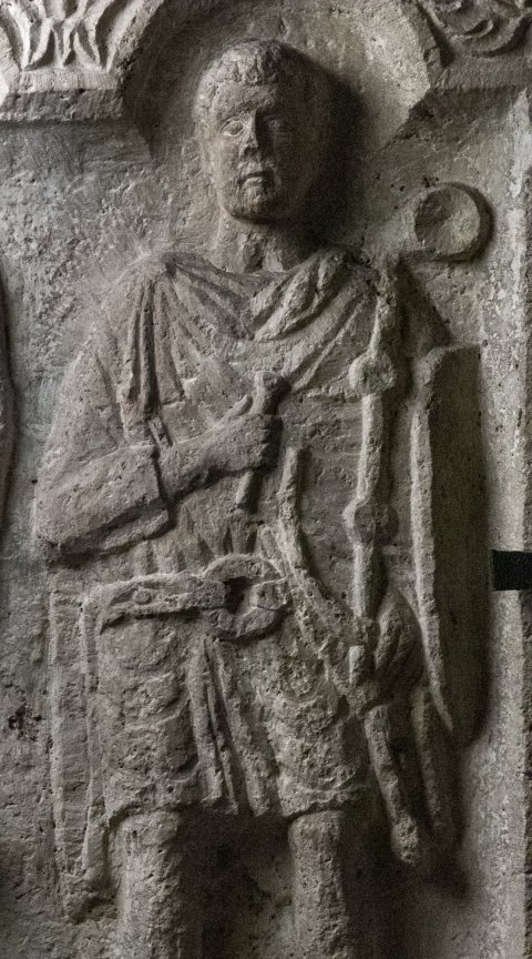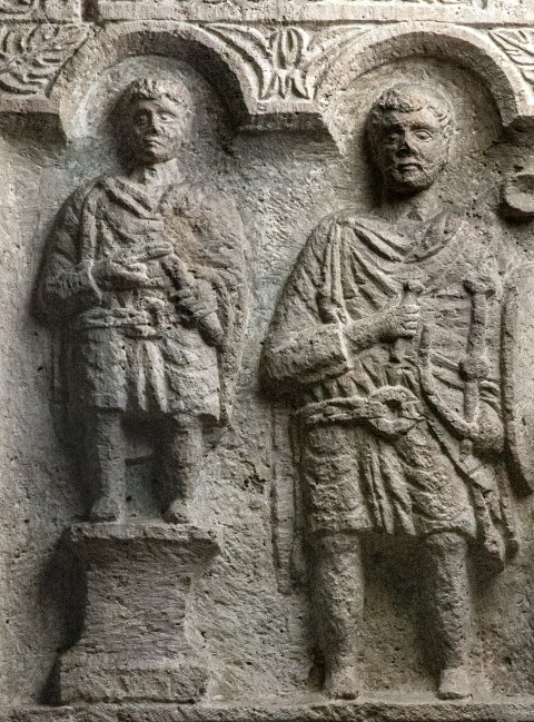 Im Hauptbild Familie, Musikinstrument: unter zwei Bögen Ganzfiguren von Mann und Kind. Links auf hohem Podest Knabe: Ärmeltunica, Gürtel mit Ringschnalle, Sagum, in der Linken Rolle (volumen). Rechts Mann (Soldat): bärtig, Ärmeltunica, Gürtel mit Ringschnalle, Sagum, über der linken Schulter Horn (cornu), in der Rechten Stab mit Knauf (?). Waffen: Schwert, Schild.