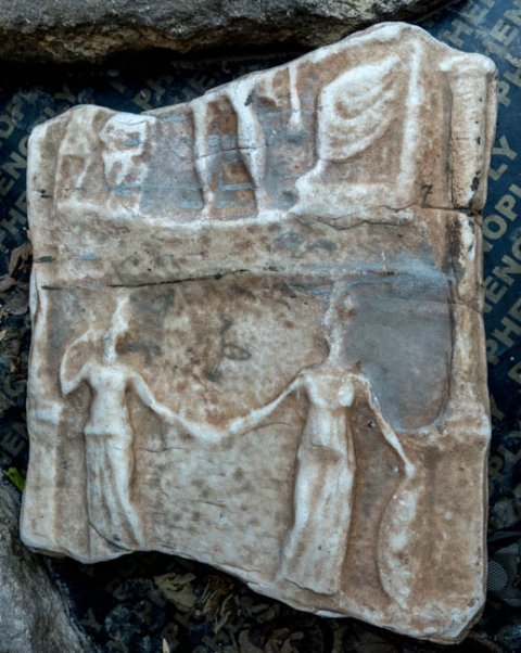- Stele mit zwei Bildfeldern. Oben stehender Jüngling, rechts sitzende Frau, links zwei kleinere Figuren. Unten zwei sich an den Händen haltende Frauen im Chiton (Nymphen ?), die rechte fasst mit der linken Hand den Rand eines Rundschilds (?). Den seitlichen Rahmen bilden Säulen auf hohen Postamenten.
