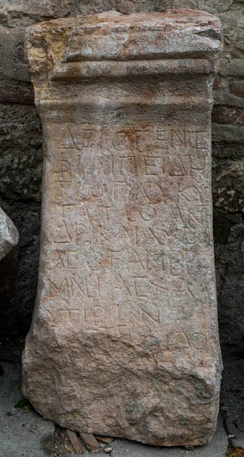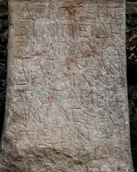 - griechisch: Δειογενὶς / Φιλιπείδῃ / τῷ γλυκυ/τάτῳ ἀν/δρὶ καὶ Λυσί/ας ὁ γαμβρὸς̣ / μνίας χά/ριν· ὑγιέ̣/[ν]ε̣τ̣αι, φίλοι