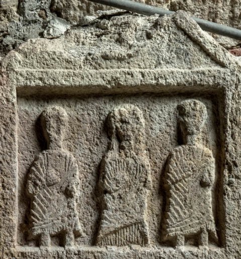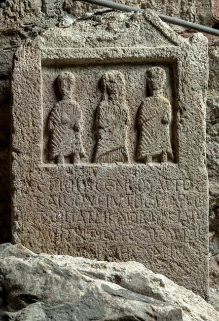 - Stele mit Giebel (Kranz ?). Im Bildfeld drei stehende Personen einer Familie (Mann, Frau, Mann).